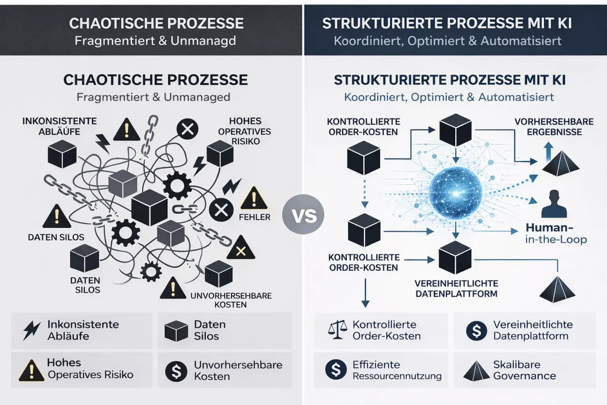 Inhalt: KI basierte Aufnahme der Kernprozesse, Pain Points, Medienbrüche und manuellen Aufwände.